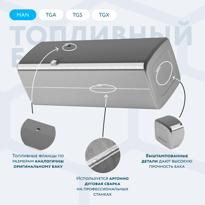 Обратите внимание, оригинальный топливный бак с артикулом 81122015707 имеет проваренное углубление под ступеньки и крепление под площадку. Наш топливный бак выпускается уже без ступеньки и крепления под площадку.