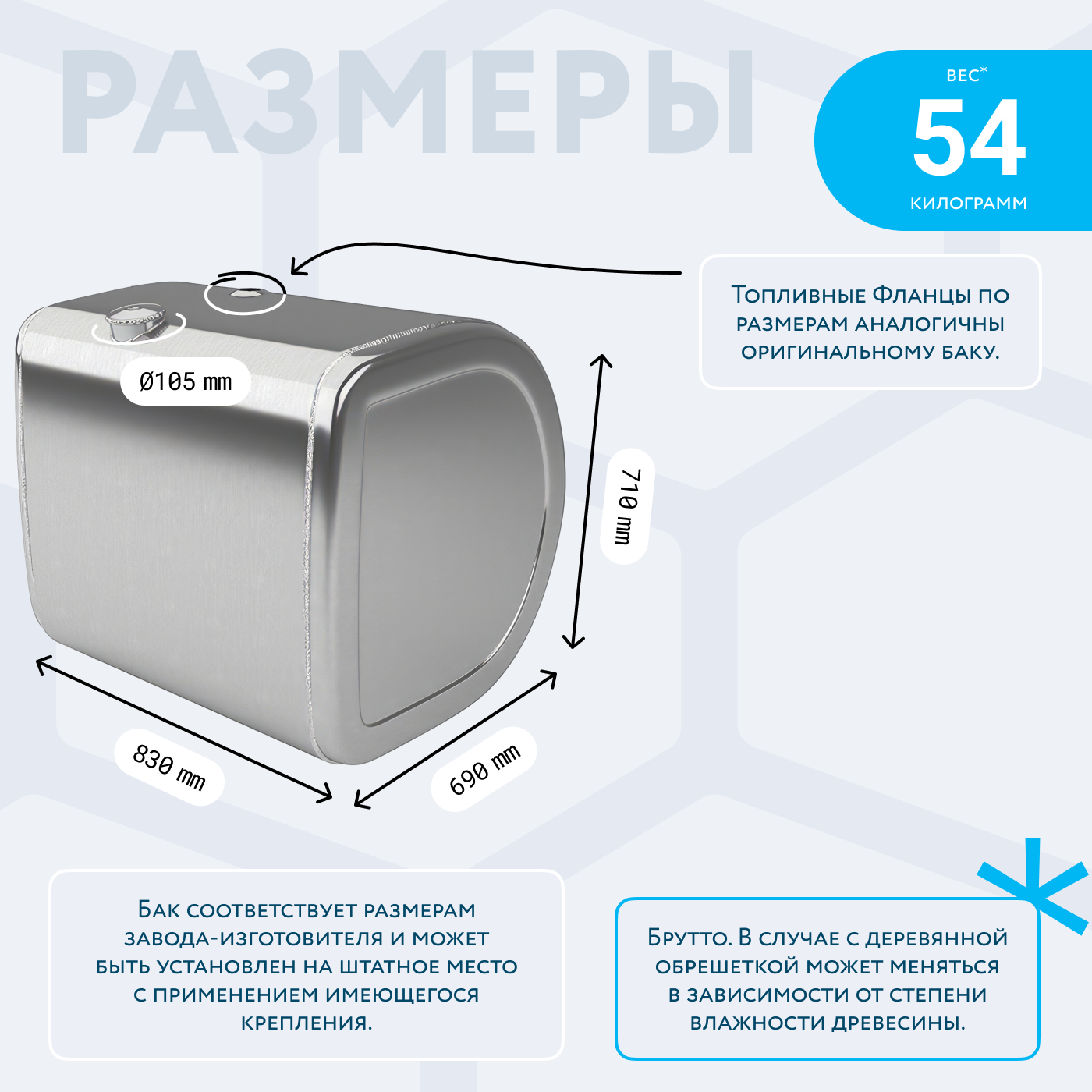 - Так же, если вы приобретаете алюминиевый топливный бак, он будет в деревянной обрешетке (для усиления защиты при транспортировке). При просчете веса и объема, цена за доставку может измениться по факту взвешивания на самом терминале транспортной компании. Так как деревянная обрешетка соответственно изготовлена из древесины, и она имеет свойство значительно набирать вес в зависимости от влажности окружающей среды.