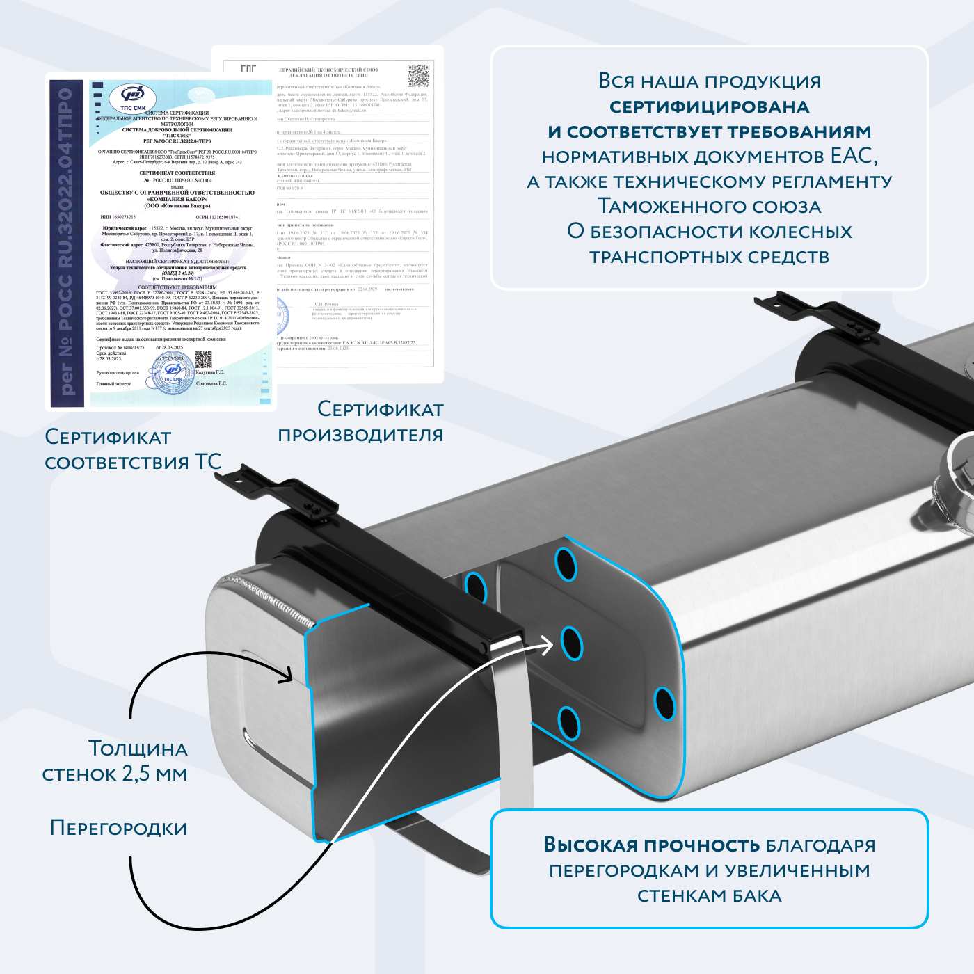 Все баки этого типа изготовлены из сортового алюминия увеличенной толщины 2.5 мм. Баки прошли сертификационные испытания. Продукция имеет паспорт и декларацию таможенного союза. Гарантия 3 года.